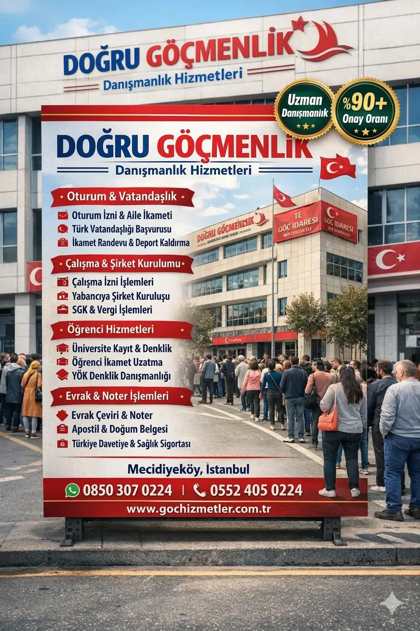 Doğru Göçmen Danışmanlık, İstanbul merkezli olarak yabancı uyruklu bireylere profesyonel danışmanlık hizmetleri sunmaktadır. Oturma izni, çalışma izni, öğrenci işlemleri, vatandaşlık başvuruları ve yabancı sağlık sigortası süreçlerinde; doğru evrak hazırlığı ve resmi işlemlerin takibiyle hızlı ve güvenilir çözümler sağlıyoruz. Tüm süreçlerde güncel mevzuata uygun, şeffaf ve sonuç odaklı hizmet anlayışıyla yanınızdayız.